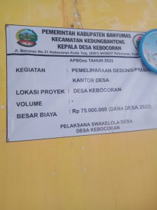 Menurut SENTONO Perangkat Desa Kebocoran Kecamatan Kedungbanteng ( Kasi Pemerintahan) Rehabilitasi Atap kantor Desa Kebocoran tersebut menghabiskan anggaran sebesar Rp, 75.000.000-, yang bersumber dari APBDES Tahun Anggaran 2025.