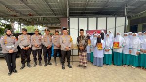 Kasat Samapta Polres Pidie Jaya Iptu Ramli bersama Kapolsek Jangka Buya Iptu Mustafa dan personel melaksanakan penyerahan bantuan sebanyak 50 Al-Qur’an kepada Pesantren Madinattudiniyah Babul Munajah.